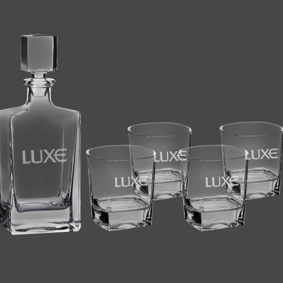 - The Decanter and each Glass are Laser Etched with the Luxe Logo