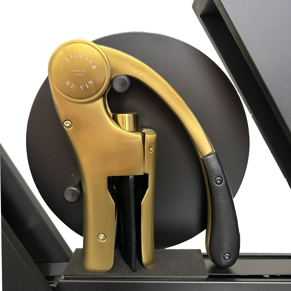 Designed to be both functional and artistic, item is packaged in a black lacquered wood box that slides apart to reveal a honeyed gold wine bottle opener with a leather handle.
